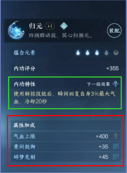 在逆水寒手游的内功系统中可以看到,每个内功都会有一个内功特性(绿色框内),也就是这个内功的附带技能,会随着等级提升强化效果。