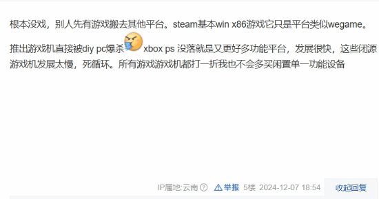 另外,也有玩家对V社推出主机的前景表示悲观:“根本没戏,别人先有游戏搬去其他平台。Steam基本Win x86游戏它只是平台,类似WeGame。推出游戏机直接被DIY PC爆杀,Xbox PS没落就是又更多功能平台,发展很快,这些闭源游戏机发展太慢,死循环。”