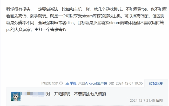 但并非所有人都持悲观看法。也有玩家提出,V社如果能够简化主机功能,专注于提供简单、直接的Steam游戏体验,或许会吸引一部分用户:“我觉得有搞头,一定要做减法,比如和主机一样,就几个游戏模式,不能查看FPS,也不能查看画质高低,到手就玩。就是一个可以享受Steam库存的游戏主机,可以搞高低配,但区别就是分辨率不同,全局强制FSR或者DLSS,目标就是那些喜欢Steam商城体验但不喜欢用传统PC的大众玩家,主打一个省事省心。”