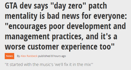 在回复中,他更将这种现象形容为“从音乐行业蔓延到游戏行业的疾病”。“这一切始于音乐行业的‘我们可以在混音时修复’,接着是电影行业的‘我们可以后期修复’,最终蔓延到游戏行业的‘我们可以通过补丁修复’。”