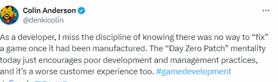 他在社交媒体中写道:“作为一名开发者,我怀念过去那种没有补救机会的开发纪律感。当一款游戏被制造完成后,就无法再进行修改。而如今的‘零日补丁’心态,只会助长糟糕的开发和管理习惯,同时让玩家的体验变得更差。”