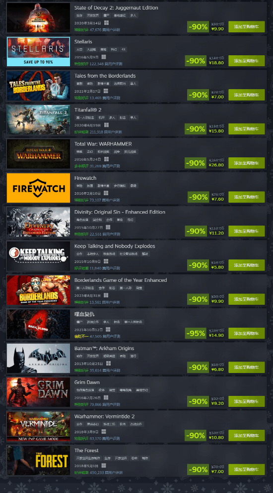 参与优惠的游戏大多为“特别好评”或“好评如潮”评价,有《刺客信条:起源》《地铁:离去》《极品飞车:热度》《泰坦陨落2》《森林》等。