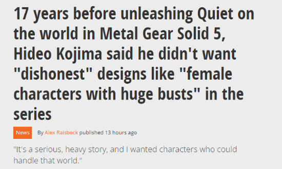 在《合金装备5》(2015年)中推出广受争议的“静静”之前,小岛秀夫曾在17年前明确表示,他不喜欢“虚假的设计”,例如“胸部夸张的女性角色”,并希望避免此类设定出现在《合金装备》系列中。