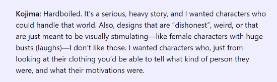 当被问及角色设计的具体要求时,小岛秀夫直言:“我要的是硬派风格。这是一个严肃而沉重的故事,我希望角色能与这个世界观匹配。”此外,他还补充了一些排除的设计方向,笑着说道:“我不喜欢那些‘虚假’、怪异、或者纯粹为了视觉刺激而存在的设计,比如胸部过大的女性角色。”