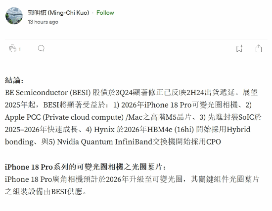 此外,郭明錤还透露,荷兰的BE Semiconductor Industries将为iPhone 18 Pro提供光圈叶片组装设备。