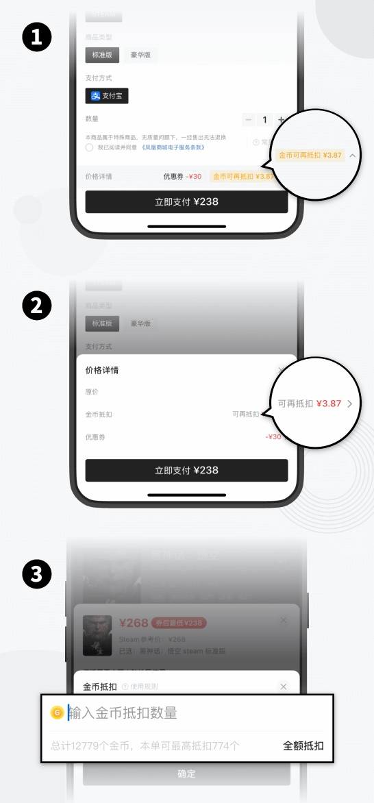 进入“游戏商城”后,选择您想要购买的游戏,点击最下方的“价格详情”找到“金币抵扣”的入口即可进入抵扣页面。随后,您可以输入想要消耗的金币数额,便可进行抵现。
