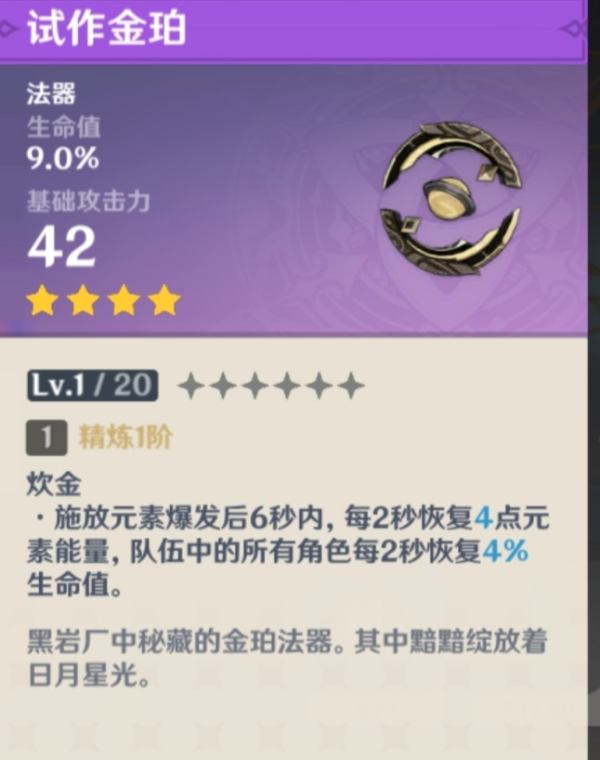 试作金珀:锻造武器,面对流血环境法师使用可以增加全队生存能力,同时也可以回能。如果生存能力操作较强,莫娜可以用讨龙和流浪替换。
