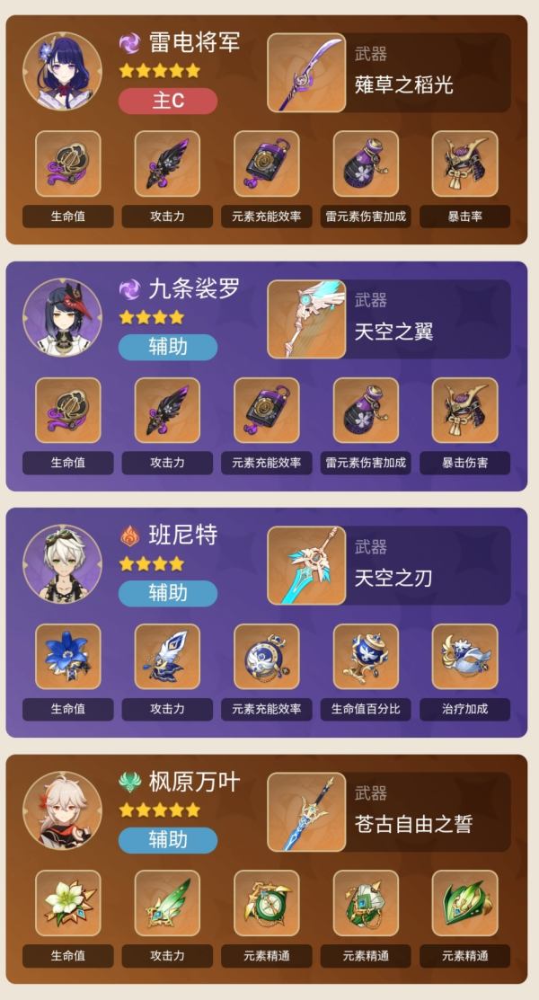 配队一:雷电将军+九条裟罗+班尼特+枫原万叶