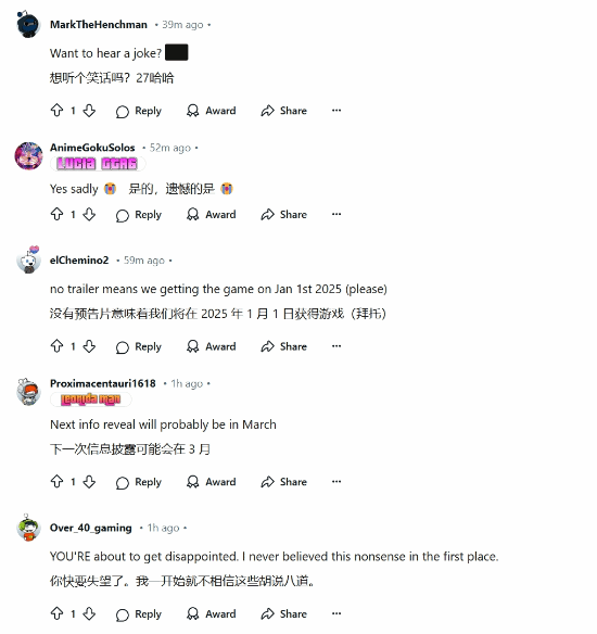 预告片的落空迅速在玩家社区中引发了强烈的失望情绪,尤其是在 Reddit 等论坛上,许多玩家纷纷发帖表达自己的不满和失望,甚至带有一些嘲讽的意味。