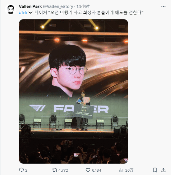 他在发言中表示:“大家好,我是Faker,非常感谢有这么多粉丝搜索我、关注我,这让我感到非常开心。与此同时,我想向今天早些时候发生的飞机事故表达深切的哀悼。”