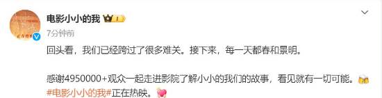 易烊千玺主演的新电影《小小的我》已于12月27日上映,官方今晚发布消息,已有约4950000+的观众看了这部励志电影,也就是观众数大约有五百万!
