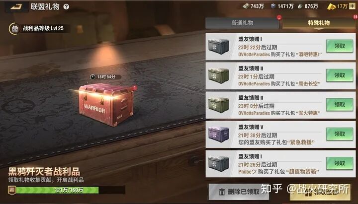 联盟礼物:分普通礼物和特殊礼物,普通礼物主要就是三大资源;特殊礼物资源比较多,包括黄金、加速、子弹、经验值、零件、兑换券、vip点数等。获取到一定点数后还有战利品,有额外的子弹、零件、资源和加速这些,所以一个好的联盟,大佬多联盟还是非常有必要的,可以加快自己发展;