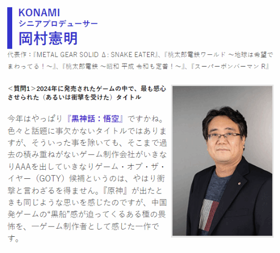 值得注意的是,这次采访中冈村典明并非唯一一个将《黑神话:悟空》选为2024年最令人震惊的游戏的人。来自光荣特库摩和Cygames等工作室的开发人员也有类似的反应。