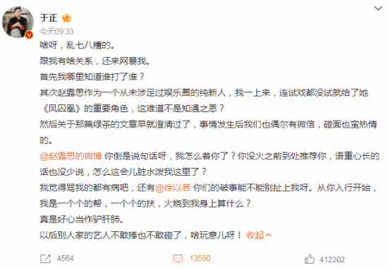 随后,徐以若的好友、编剧于正发文回应“殴打”赵露思传闻,称自己和此事无关但却被泼了脏水,并表示自己对赵露思有知遇之恩,要求赵露思“倒是说句话呀”。