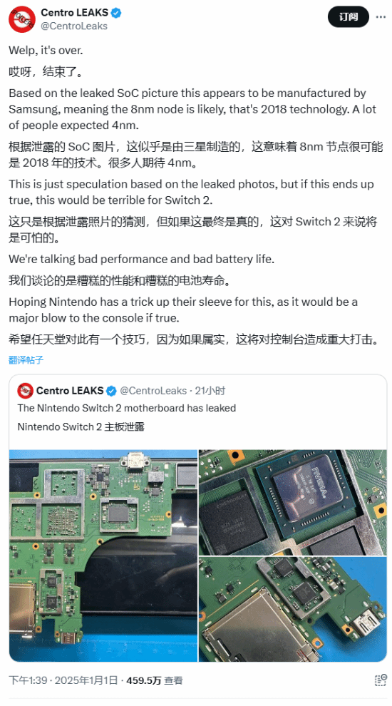 推主@CentroLeaks日前针对这些照片发推表述了自己的感想,认为Switch 2的性能和续航或都不佳。“完了,根据泄露的SoC照片,这似乎是由三星制造的,很可能使用的是8nm工艺节点,但这是2018年的技术,很多人原本期待的是4nm工艺。虽然目前只是基于泄露照片的推测,但如果属实,对Switch 2来说将是个糟糕的消息,这可能意味着机器的性能和续航方面或都不佳。希望任天堂对此有所准备,否则这种情况一旦坐实,可能会对Switch 2主机造成重大打击。”