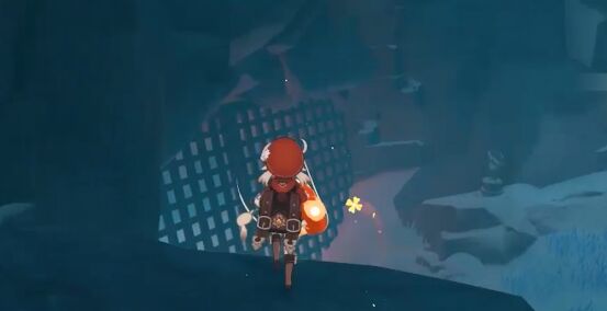 往谷底走,相对比较难一点,需要先解锁平台上冰柱,跟随温暖仙灵足迹一次使用冰元素解锁冰柱