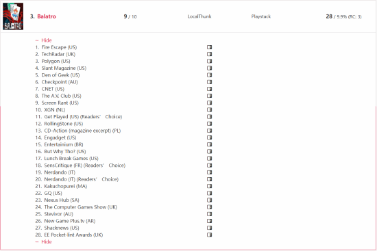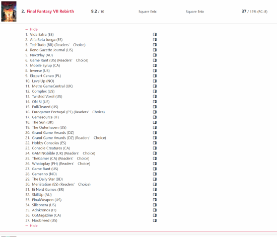 Square Enix《最终幻想7:重生》位列第二,共获得了37项奖项;独立作者LocalThunk打造的《小丑牌》以28项年度最佳位列第三;Atlus《暗喻幻想》排在第四名,共获得了25项年度最佳;国产游戏《黑神话:悟空》排在第五,共获得21项年度最佳奖项。