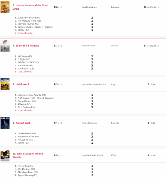 第六至第十位分别是《夺宝奇兵:古老之圈》《寂静岭2重制版》《地狱潜者2》《动物井》以及《如龙8》。