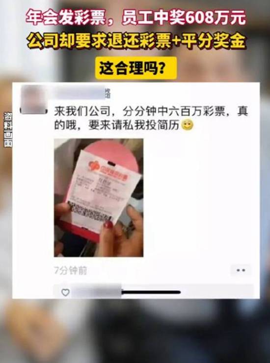 没想到的是,一位员工的竟然幸运地中了一等奖,奖金高达608万元。公司在得知此事后,要求员工退还这张,并计划将奖金平分给所有参加年会的人。