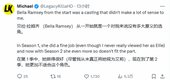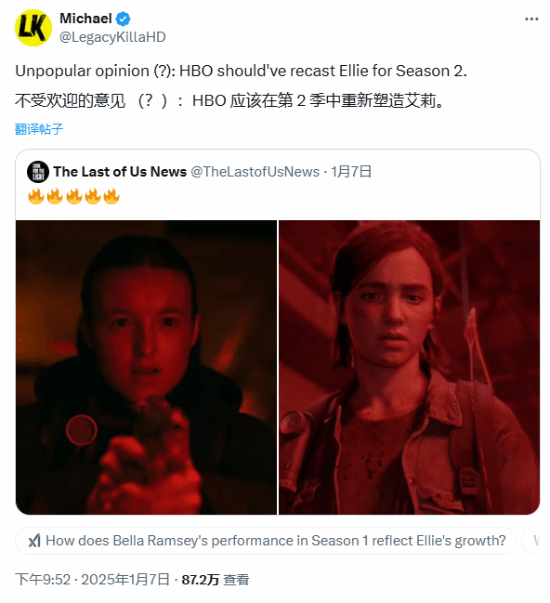 同日,推主@LegacyKillaHD发推转发了由小熊女贝拉·拉姆齐扮演的艾莉与《最后生还者2》游戏里艾莉的对比图,认为HBO应该在第二季剧集里重新选角艾莉。@LegacyKillaHD称,贝拉·拉姆齐在《最后生还者》第一季剧集的表现很不错,但到了第二季,她就不适合艾莉这个角色了。