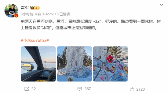 今日,雷军还在微博晒出了黑河的冰树,还“解锁”了几项新技能,例如泼水成冰。