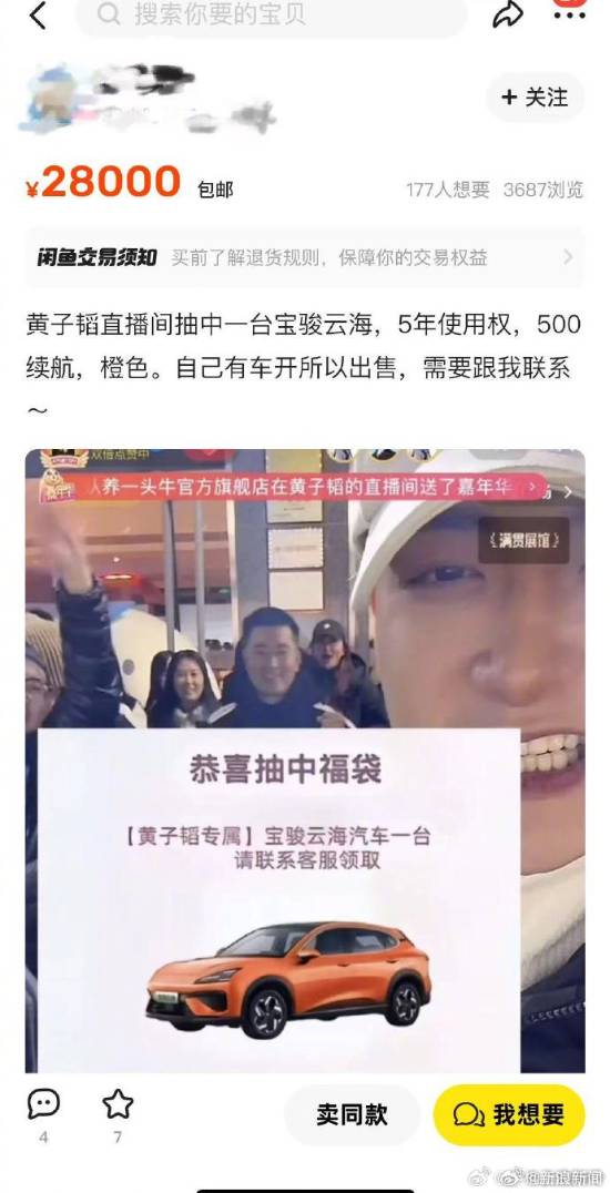经二手交易平台检索发现,已有售卖相关车辆的帖子出现,内容赫然标注 “黄子韬直播间抽中一台宝骏云海,有意私聊”。