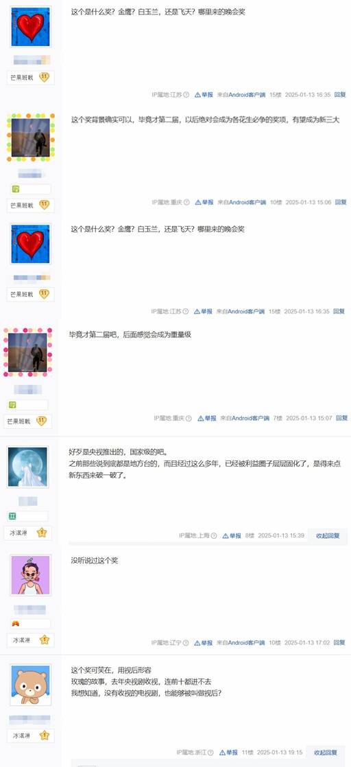“这个是什么奖?金鹰?白玉兰,还是飞天?哪里来的晚会奖”、“没听说过这个奖”:当然,也有部分网友对该奖项的认知度不高,对其权威性表示疑问。