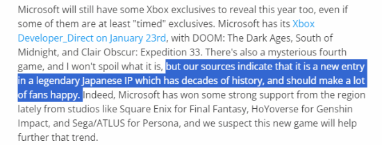 外媒windowscentral主编Jez Corden发布最新爆料谈及神秘游戏:“根据我们的消息来源获悉,它是一个拥有数十年历史的日本传奇IP的新作品,应该会让很多粉丝感到高兴。”