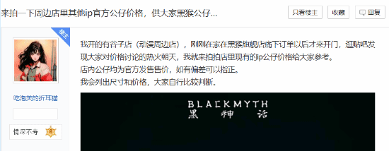 今日有吧友@吃泡芙的折耳猫发帖,表示自己开了一家动漫周边店,逛贴吧发现玩家们对《黑神话》周边产品的价格讨论的热火朝天,于是就拍了自家店里一些现有的IP公仔价格给大家参考,以便玩家自行判断。