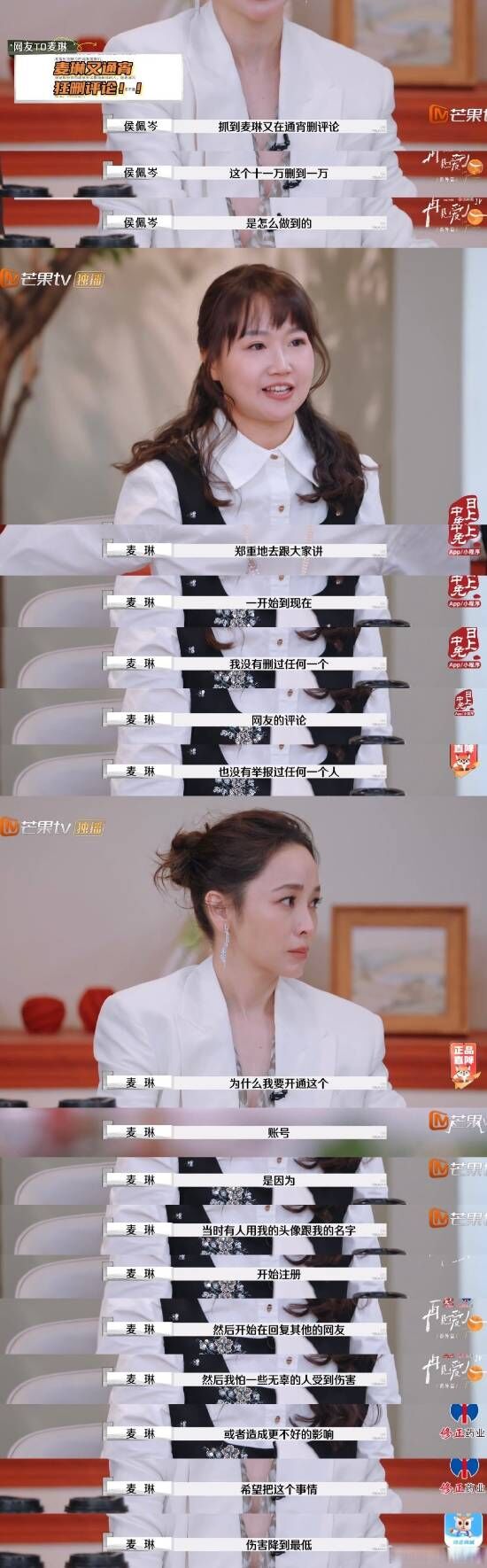 在1月16日的《再见爱人》回门宴上,麦琳表示自己是担心有人会被骗,这才开了账号,而且她都没有删除那些骂她的评论:“我没有举报过任何一个骂我的人,也没有删除任何一条评论。”
