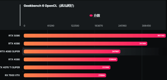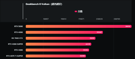 在Geekbench Vulkan测试中,RTX 5090的跑分约为359,000和331,000,相较于RTX 4090的262,000分,性能提升约为33%。而在Geekbench OpenCL测试中,RTX 5090的跑分分别为367,000、356,000和338,000,相较于RTX 4090的317,000分,评价仅提升约15%。