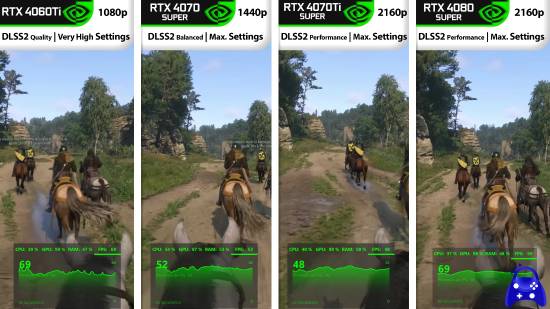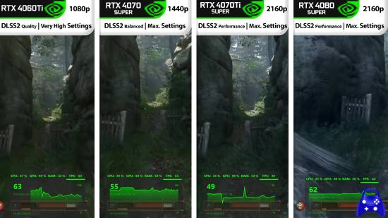 PC:4K最高设置,使用DLSS 2|RTX 4080 Super/4070Ti Super/4070 Super/4060Ti|i9 12900K|32GB DDR5