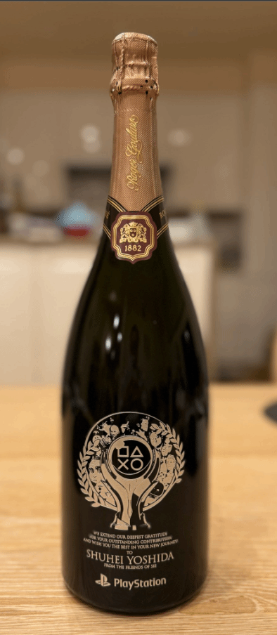 一瓶包装精致的红酒,其中印着白金奖杯的图案,四周是PS游戏热门IP人物以及吉田修平的头像,文字写着“我们对您杰出的贡献表示最深切的感谢,并祝愿您在新的旅程中一切顺利。”
