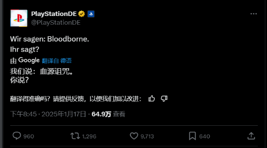 近日,索尼德国官方在推特发文询问:“我们说:血源;那你们会说什么?”下方玩家们也很配合,纷纷表示想要重置版或者PC版!