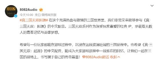 官方表示,非常荣幸能够参与《真·三国无双:起源》的中文配音。希望中配能成为大家游戏旅程中一段难忘的回忆,让我们一起在三国的战场上,书写属于自己的传奇篇章。