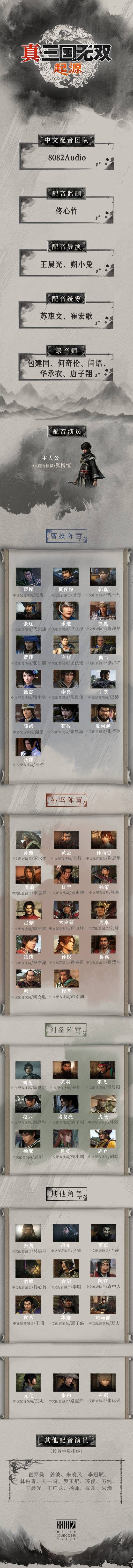 《真·三国无双:起源》已于1月17日正式发售,中文配音阵容官宣! 由国内知名配音团队8082Audio(曾参加黑神话悟空),佟心竹担任配音监制,王晨光、朔小兔担任配音导演。