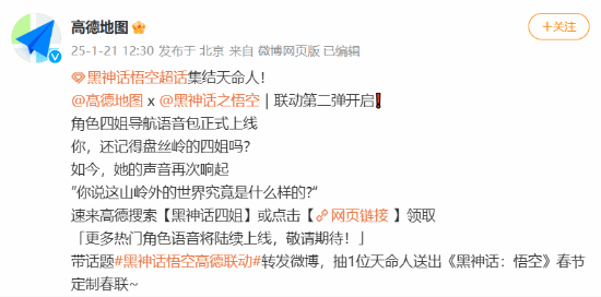 来听四妹:高德地图《黑神话:悟空》四妹导航语音包上线!