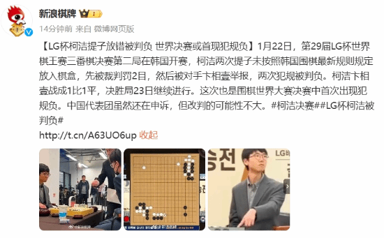 新浪棋牌消息,1月22日,第29届LG杯世界棋王赛三番棋决赛第二局在韩国开赛,柯洁两次提子未按照韩国围棋最新规则规定放入棋盒,先被裁判罚2目,然后被对手卞相壹举报,两次犯规被判负。
