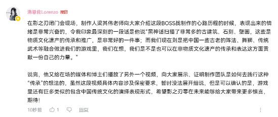 洛恩佐透露,在《影之刃》闭门会上,制作人梁其伟向与会者介绍了这段BOSS战的制作历程,并表现得非常兴奋。其中一句令洛恩佐印象深刻的话是:“《黑神话》扫描了非常多的古建筑、石刻、壁画,这些是物质文化遗产的传承和推广,是非常好的一件事;而我们现在则是把中国一些古老的阵法、舞狮、传统武术等融合做进我们的游戏里,我们在想,我们是不是也可以在非物质文化遗产的传承和表达这方面贡献一份自己的力量。”
