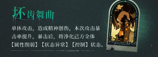 对敌方单体输出精神创伤,提升暴击率的同时还可以净化队伍全体【状态异常】【控制】【属性削弱】状态。
