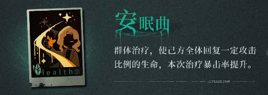 群体增益技能,可以回复一定比例的生命值,治疗后提升队伍暴击率。