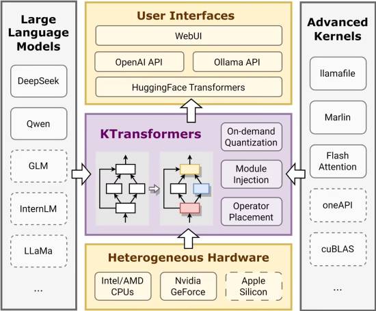 据官方介绍,KTransformers 是一个灵活的、以 Python 为中心的框架,其设计核心是可扩展性、通过用一行代码实现和注入一个优化模块,用户就能访问兼容 Transformers 的界面、符合 OpenAI 和 Ollama 标准的 RESTful API,甚至是类似 ChatGPT 的简化网页用户界面。