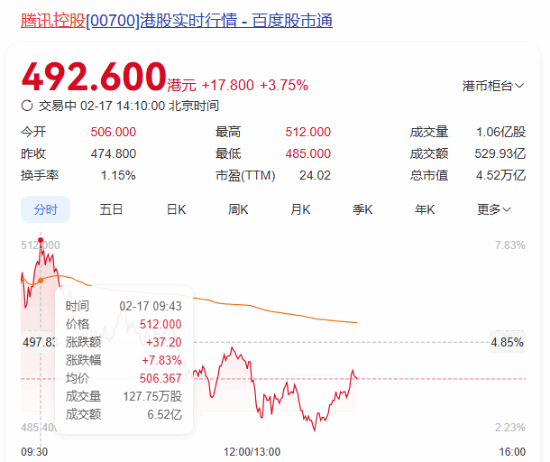 2月17日,腾讯港股及相关概念股出现了暴涨的现象。上午10点之前,腾讯控股涨超7.5%,市值暴增约3200亿港元(约合人民币2981亿元)。腾讯相关的概念股也得到了大幅增长:微盟集团涨15%、阅文集团涨11.97%、有赞涨10.16%。