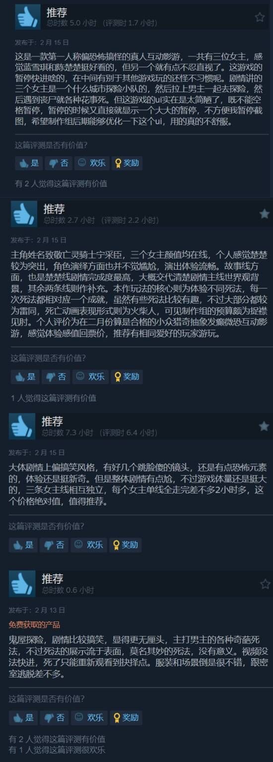 部分给出评价的玩家表示,《杠精的108种死法》虽然是一款恐怖游戏,但剧情比较搞笑,显得无厘头,主打男主的各种奇葩死法。游戏的体量较大,三条女主线相互独立,每个女主单线全走完差不多2小时左右,能够对的起它的价格。但美中不足的是,游戏的UI较为糟糕,希望后期可以优化一下。