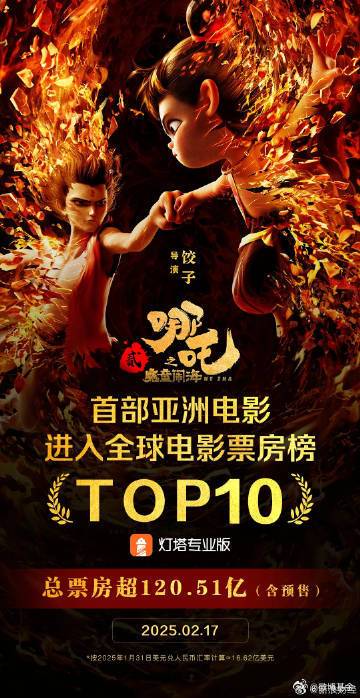 冲进全球影史票房榜前十之后 《哪吒2》即将冲顶全球动画榜!