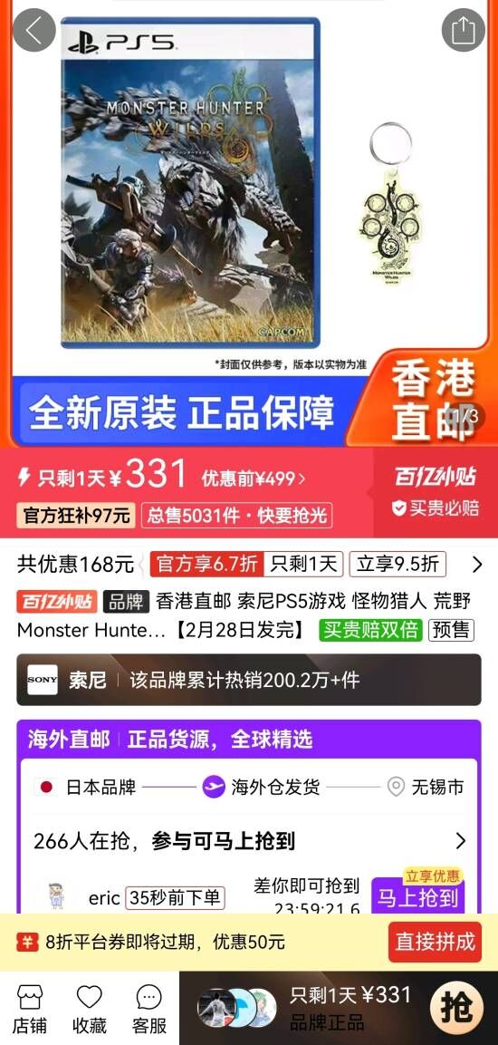 《怪物猎人:荒野》百亿补贴好价!PS5光盘331元入手