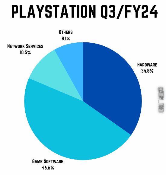 根据推特博主@Zuby_Tech的消息称,在2024财年第三季度中,PlayStation游戏软件带来的收入占总收入的46.6%,收入约53亿美元!(大约为人民币384亿元)