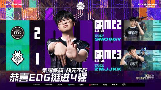 就在今天凌晨的《无畏契约》曼谷大师赛瑞士轮比赛中,EDG以2:1的比分成功战胜G2战队,以2/0的积分一场不败杀出瑞士轮,晋级曼谷大师赛四强!