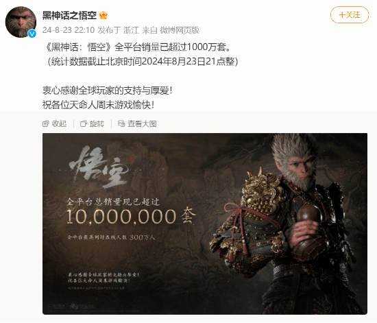 《黑神话悟空》自公布以来,其一举一动便广受业内外人士的关注,除了其优秀的质量以外,游戏的销量也让很多人感到不可思议:本作在发售3天后便达成了千万销量的壮举。