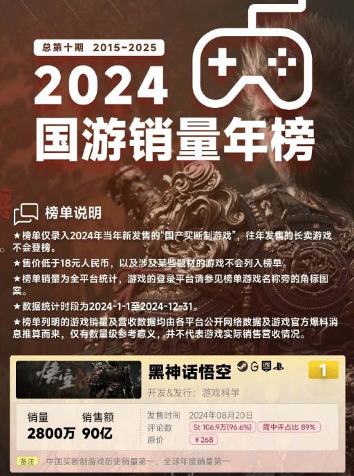 而根据微博账号“国游销量榜”发布的2024年国游销量年榜统计的数据表明,截止2024年12月31日,《黑神话:悟空》总销量达到了惊人的2800万份。